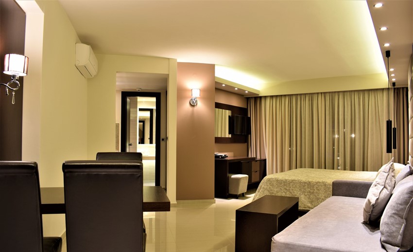 Each Superior Studio is an open plan room with Twin Beds joined together and an additional Sofa Bed (to accommodate a 3rd person), a Bathroom with a Body Spray Massage Shower, a kitchenette, and a furnished balcony or terrace.